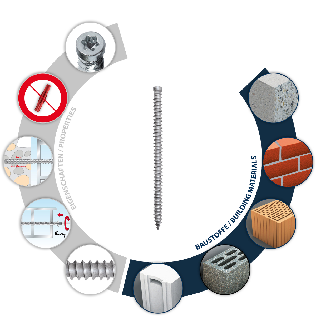 - Bohrloch-Ø, Einschraub- und Bohrlochtiefe der verschiedenen Baustoffe beachten