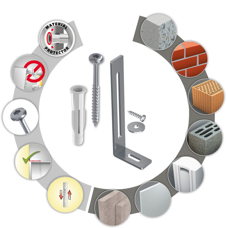Diese Kippsicherung schützt vor umfallenden Möbeln und sorgt für dauerhafte Sicherheit, ob im Wohnzimmer, Schlafzimmer oder Badezimmer - Schränke, Regale, Kommoden und Tische etc. bleiben zuverlässig an der Wand befestigt. Möbelstücke können sowohl durch Hochklettern oder unbedachtes Hochziehen als auch durch Abstützen oder Anlehnen leicht umkippen. Ebenso kann eine zu schwere Beladung mit anschließendem Öffnen mehrerer Schubladen problematisch sein. Die Montage der Kippsicherungen ist ganz einfach und schnell vorzunehmen. Sie sind unauffällig anzubringen und stören somit nicht die Optik. Außerdem lassen sich die Kippsicherungen durch die beiliegenden Allzweckdübel und Schrauben in nahezu jedem Baustoff anwenden.