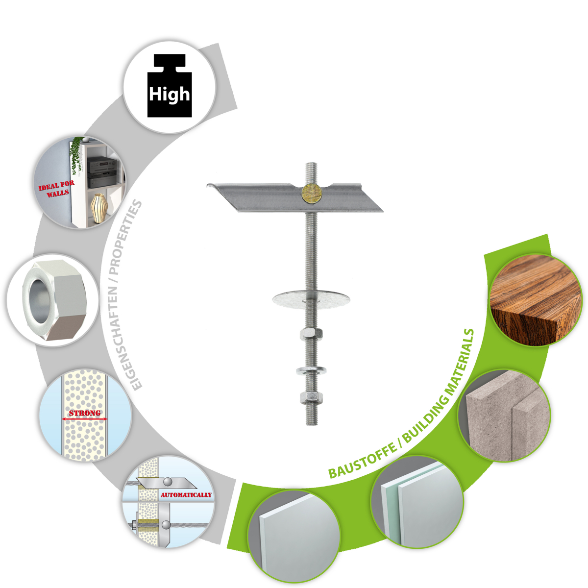 - Galvanisch verzinkter Hohlraumdübel aus Metall mit einem Kippflügel, Gewindestange, einer großen und einer kleinen Unterlegscheibe aus Metall und zwei Sechskantmuttern (SW 13)