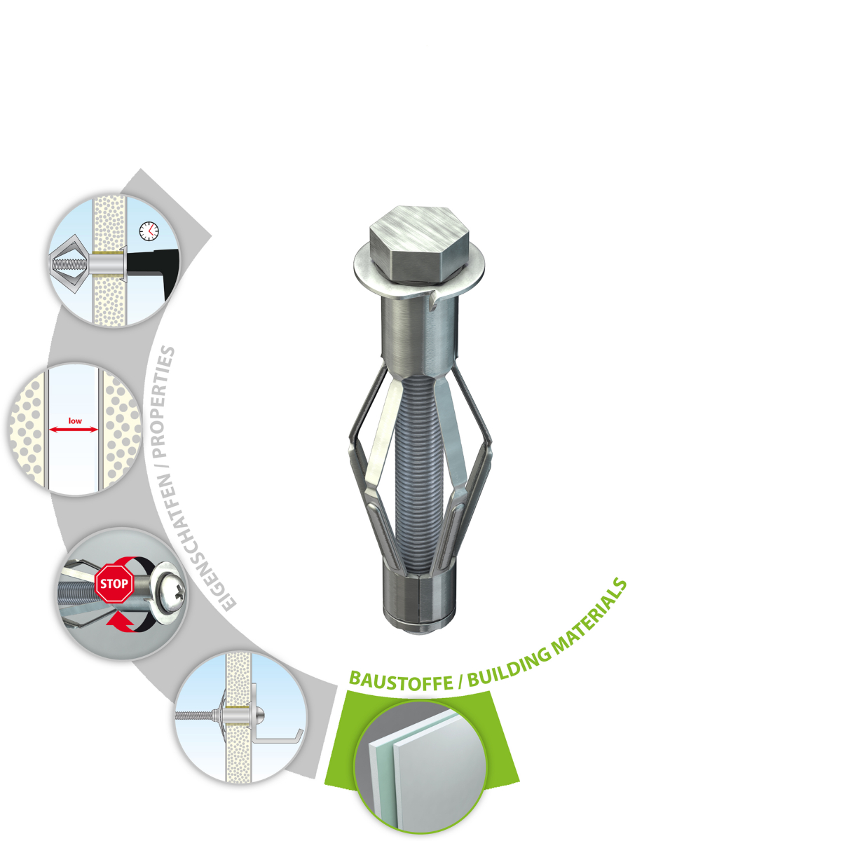 - Galvanisch verzinkter Metallhohlraumdübel mit Dübelkappe, Drehsicherungen und metrischer Schraube mit Sechskant- (SW 13) bzw. Schlitz- und Kreuzschlitzantrieb
