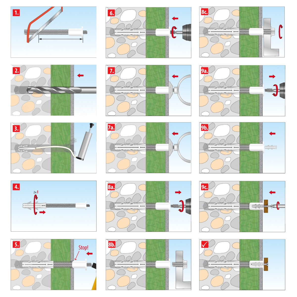 - Bohrloch mit Ø14 mm im Baustoff erstellen (Bohrlochtiefe 90mm + tWDVS)