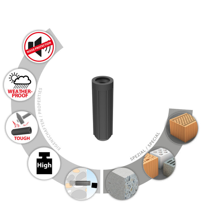 Der TOX Schallschutzdübel Sonic für Unterkonstruktionen und schallhemmende Konstruktionen eignet sich für viele Baustoffe, ob Beton, Vollziegel, Leichtbeton oder Kalksandstein - die perfekte Befestigungslösung mit hohen Haltewerten für Kabel- und Rohrschellen, Wandkonsolen für Heiz- und Klimageräte, Handläufe oder Geländer!