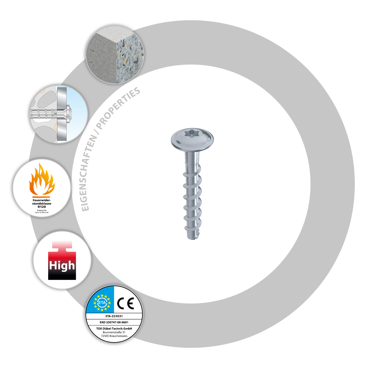 **TOX Schraubanker Sumo Max 1 6x50 FK (100 Stk.)**TOX Schraubanker Sumo Max 1 FK 6x50 mm, Flachkopf, Stahl verzinkt Die TOX Sumo Max 1 FK Schraubanker aus verzinktem Stahl eignen sich ideal zum Befestigen von Kabelkanälen, Deckenabhängungen, dünnen Profilen und vielem mehr. Die TOX Sumo Max 1 FK Betonschrauben sind bauaufsichtlich zugelassen und in verschiedenen Größen erhältlich. Verschiedene Einschraubtiefen und somit verschiedene Klemmstärken zugelassen Einfache und schnelle Montage Feuerwiderstandklasse R120 Bauaufsichtlich zugelassen für gerissenen und ungerissenen Beton oder als Mehrfachbefestigung Sofort belastbar Für Hohlraumdeckenplatten zugelassen Lieferumfang: 1x Kartonage Schraubanker Sumo Max 1 FK 6x50 mm, 100 Stück Geliefert werden die TOX Sumo Max 1 FK Betonschrauben sortenrein in der handlichen TOX-Kartonage: Damit ist garantiert alles sauber verstaut, sicher transportierbar und schnell griffbereit. Die Kartonagen sind stabil und schützen vor Staub und Dreck. Der „rote Allzweckdübel“ hat TOX bekannt gemacht: Auf dem Gebiet der Allzweckdübel ist das Unternehmen führend. Das umfassende Sortiment ist konsequent auf die Bedürfnisse der Kunden und Endanwender ausgerichtet. Die Marke TOX steht für innovative Produkte und kompetente Lösungen im Bereich der Befestigungstechnik.