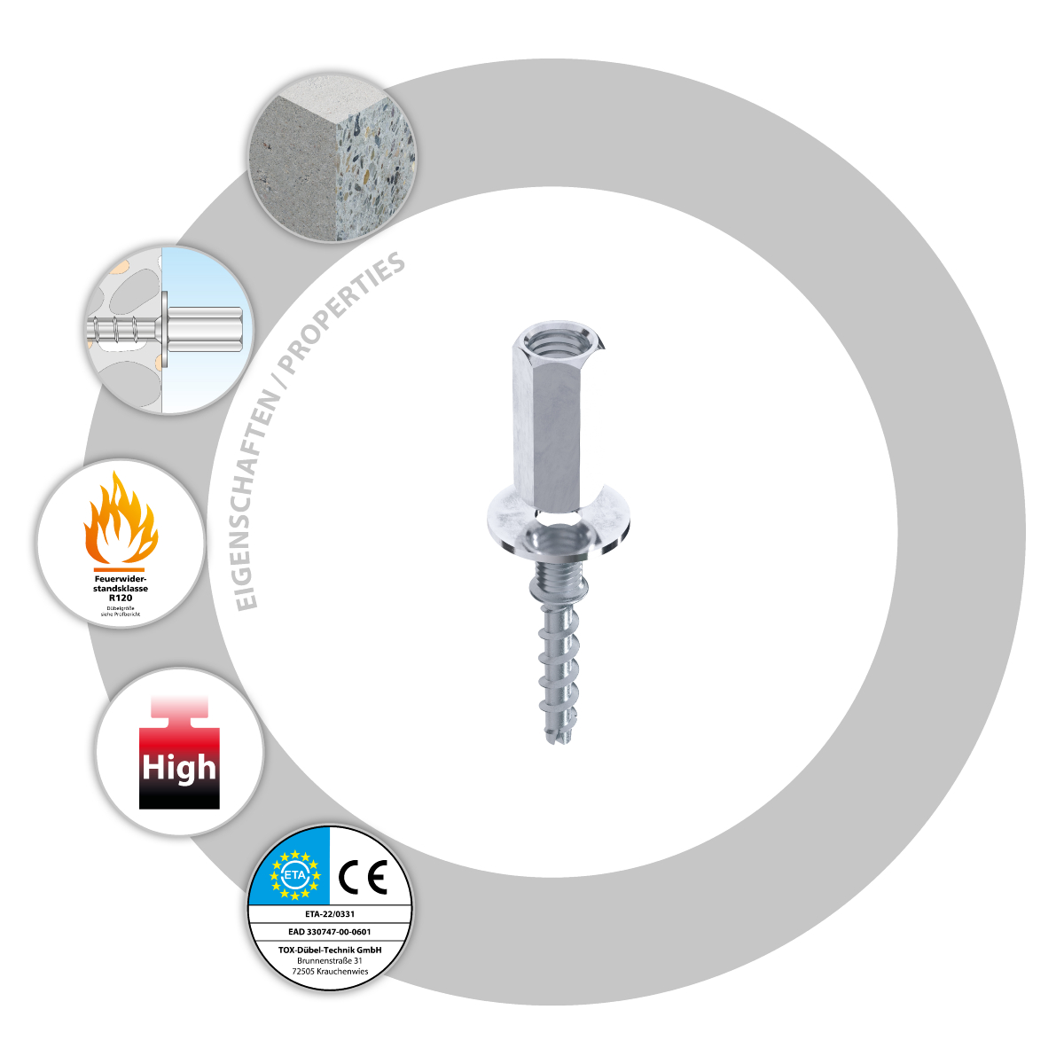 **TOX Schraubanker Sumo Max 1 6x35 IM (50 Stk.)**TOX Schraubanker Sumo Max 1 IM 6x35 mm, mit Innengewinde M8/M10, Stahl verzinkt Die TOX Sumo Max 1 IM Schraubanker aus verzinktem Stahl eignen sich ideal zum Befestigen von abgehängten Rohren. Verschiedene Einschraubtiefen und somit verschiedene Klemmstärken zugelassen Einfache und schnelle Montage Feuerwiderstandklasse R120 Bauaufsichtlich zugelassen für gerissenen und ungerissenen Beton oder als Mehrfachbefestigung Sofort belastbar Für Hohlraumdeckenplatten zugelassen Lieferumfang: 1x Kartonage Schraubanker Sumo Max 1 IM 6x35 mm, 50 Stück Geliefert werden die TOX Sumo Max 1 IM Betonschrauben sortenrein in der handlichen TOX-Kartonage: Damit ist garantiert alles sauber verstaut, sicher transportierbar und schnell griffbereit. Die Kartonagen sind stabil und schützen vor Staub und Dreck. Der „rote Allzweckdübel“ hat TOX bekannt gemacht: Auf dem Gebiet der Allzweckdübel ist das Unternehmen führend. Das umfassende Sortiment ist konsequent auf die Bedürfnisse der Kunden und Endanwender ausgerichtet. Die Marke TOX steht für innovative Produkte und kompetente Lösungen im Bereich der Befestigungstechnik.