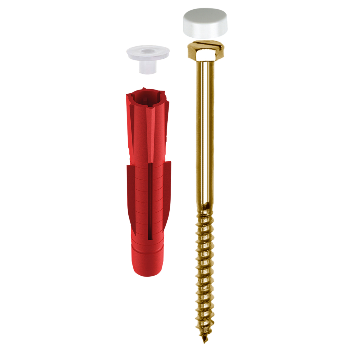 - Zwei Tri-Dübel (8/51), zwei Kunststoff-Unterlegscheiben mit Bund, Messing-Sechskantschraube (SW 10) und Abdeckkappen weiß und/oder verchromt