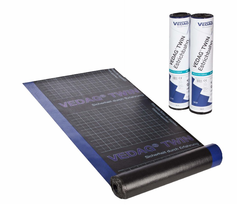 VEDAG TWIN Estrichbahn ist eine weiterentwickelte Spezialbahn gemäß DIN EN 13970 und DIN EN 13969 für die Feuchtigkeitsabdichtung unter Estrich-Konstruktionen mit einer Aluminiumpolyesterkombination, die durch ein Glasvlies gegen Rauhigkeit des Untergrundes geschützt ist.