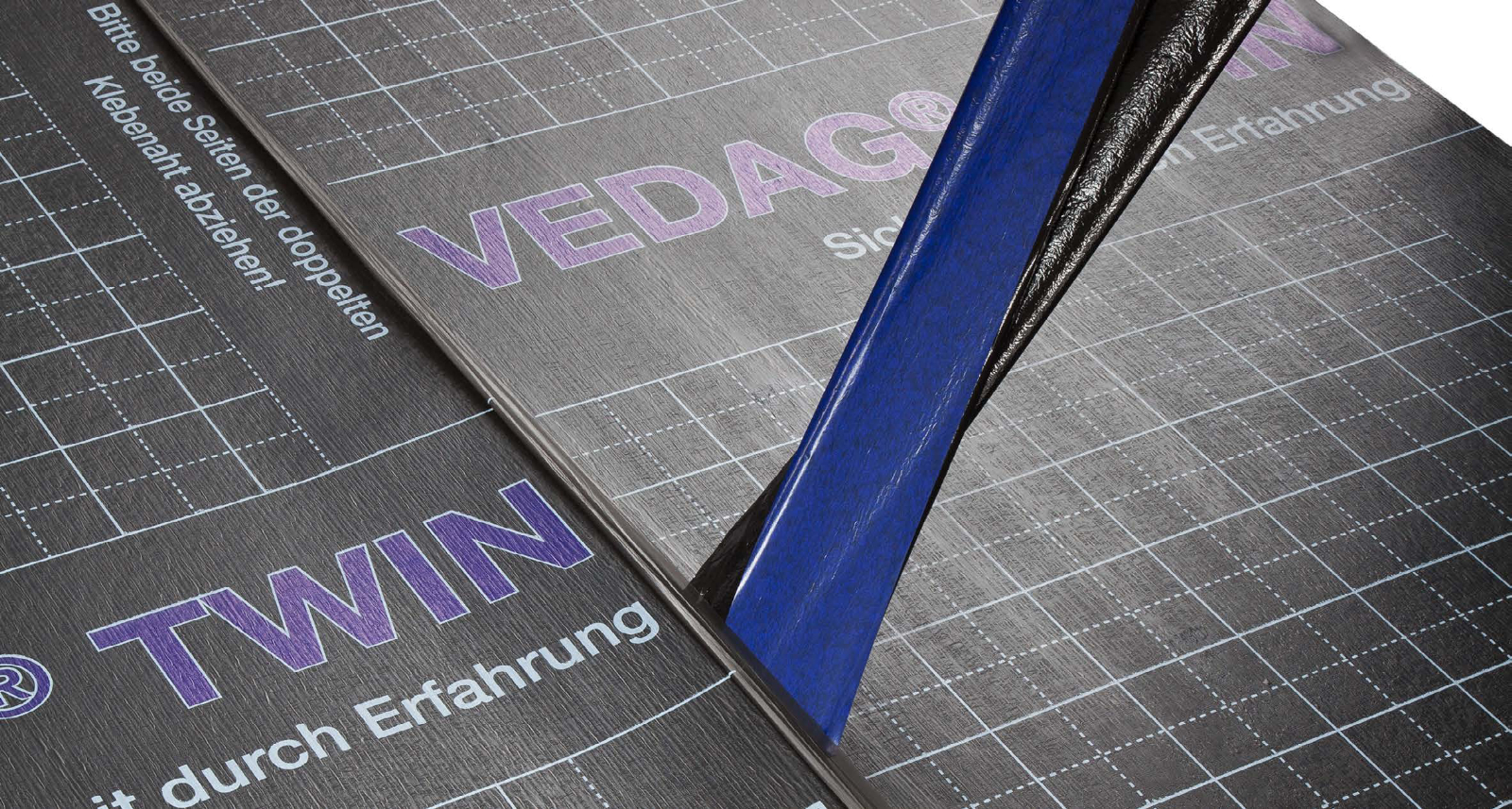 VEDAG TWIN Estrichbahn wird auf ebener, von Graten befreiter und gesäuberter Bodenfläche kantengerade lose mit 10cm Überdeckung verlegt. Die Längsnaht wird nach Abziehen der silikonisierten Nahtstreifen auf Ober- und Unterseite verklebt. Die Quernaht wird mit dem TWIN-Anschlussstreifen überdeckt und verklebt. Die Überdeckungsstufen sind mit VEDAGPLAST Elastik-Kitt zu unterlegen und alle Nähte sind fest anzudrücken. An aufgehenden Bauteilen wird TWIN mindestens bis zur geplanten Estrichoberkante hochgeführt.