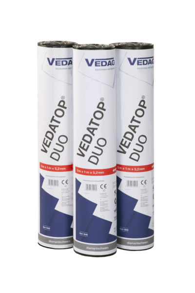 VEDATOP DUO ist eine Polymerbitumen-Schweißbahn als Oberlage für mehrlagige Dachabdichtungen in höchster Qualität gemäß DIN EN 13707, DIN EN 13969, DIN SPEC 20000-201 und DIN SPEC 20000-202 mit technischen Werten weit über den Mindestanforderungen der Normen.