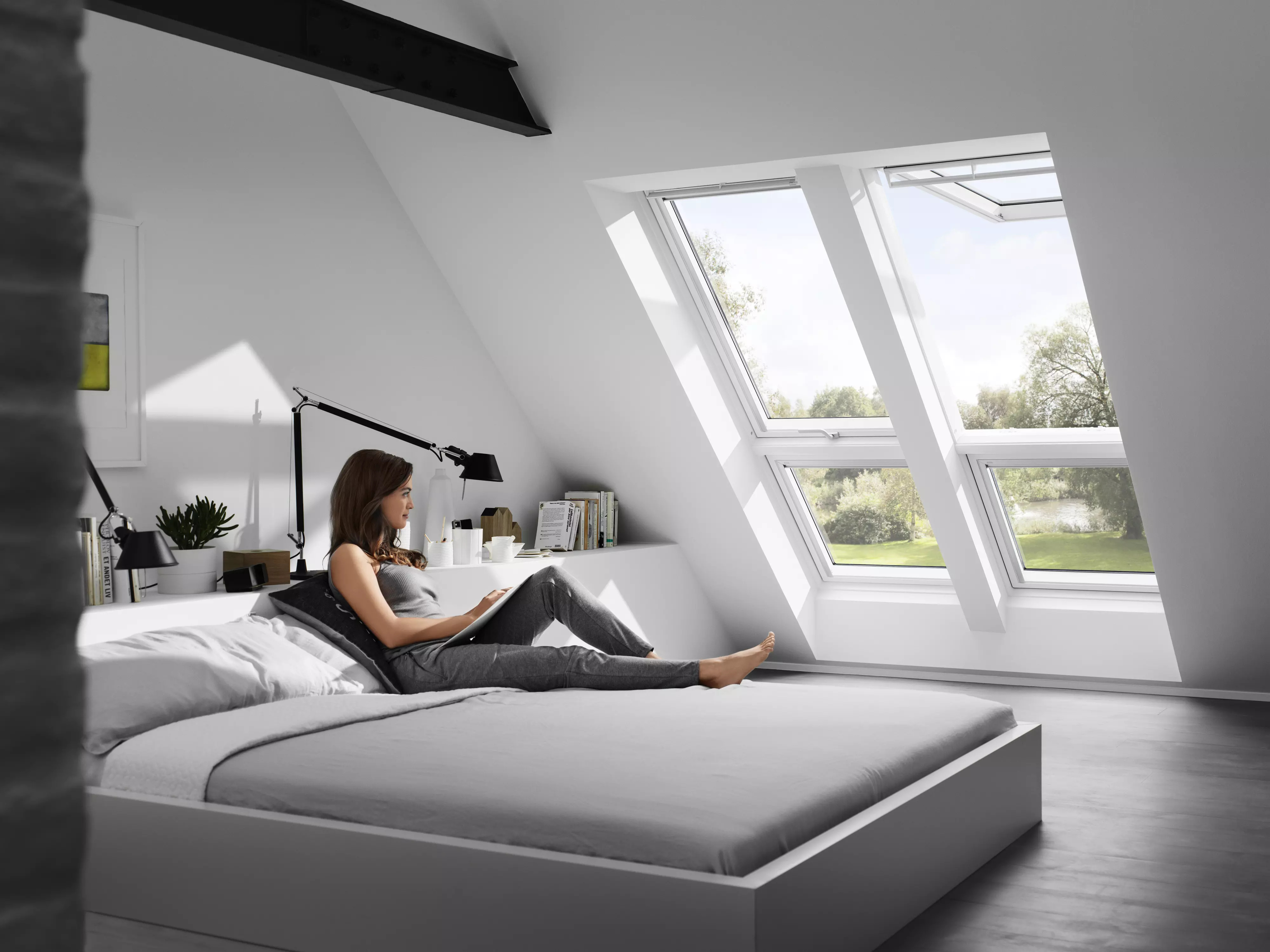 Innenfutter für 2 Fenster nebeneinander eingebaut mit Zusatzelementen GIU/GIL als Lichtlösung QUARTETT mit Kombi-Eindeckrahmen unter Verwendung des Hilfssparrens EKY.