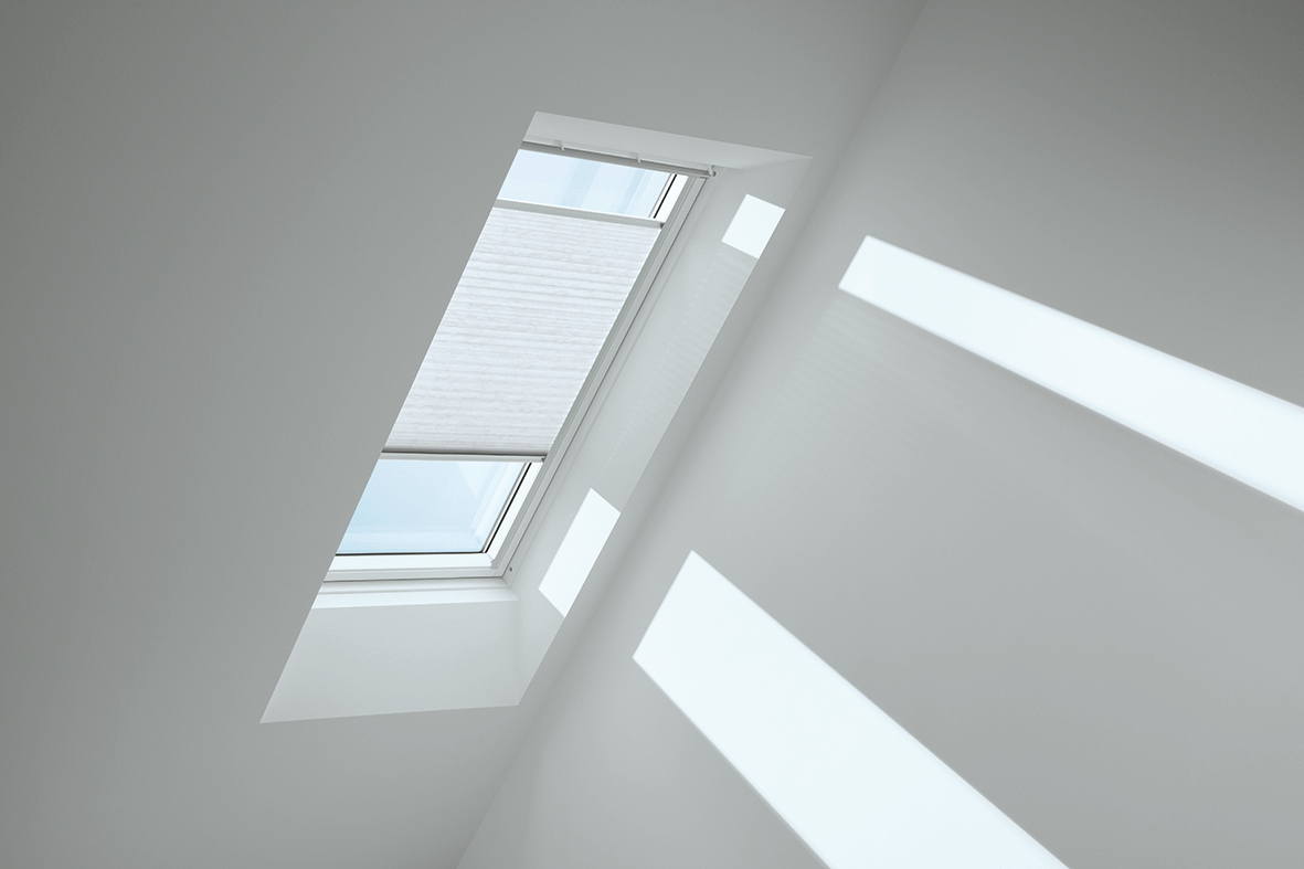 Lichtdurchlässige VELUX Plissees tauchen die Wohnräume Ihrer Kunden in eine besonders sanfte Lichtstimmung und schaffen individuelle Deko-Akzente.