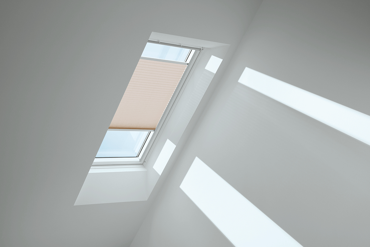 Lichtdurchlässige VELUX Plissees tauchen die Wohnräume Ihrer Kunden in eine besonders sanfte Lichtstimmung und schaffen individuelle Deko-Akzente.