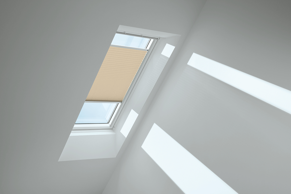 Lichtdurchlässige VELUX Plissees tauchen die Wohnräume Ihrer Kunden in eine besonders sanfte Lichtstimmung und schaffen individuelle Deko-Akzente.