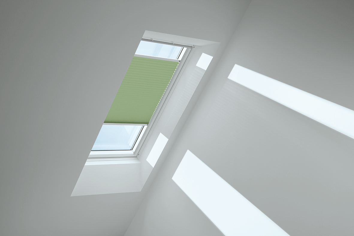 Lichtdurchlässige VELUX Plissees tauchen die Wohnräume Ihrer Kunden in eine besonders sanfte Lichtstimmung und schaffen individuelle Deko-Akzente.