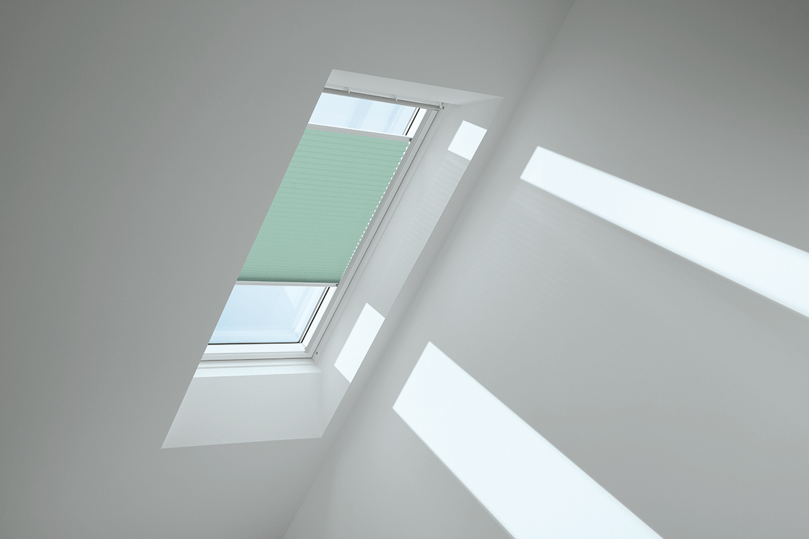 Lichtdurchlässige VELUX Plissees tauchen die Wohnräume Ihrer Kunden in eine besonders sanfte Lichtstimmung und schaffen individuelle Deko-Akzente.