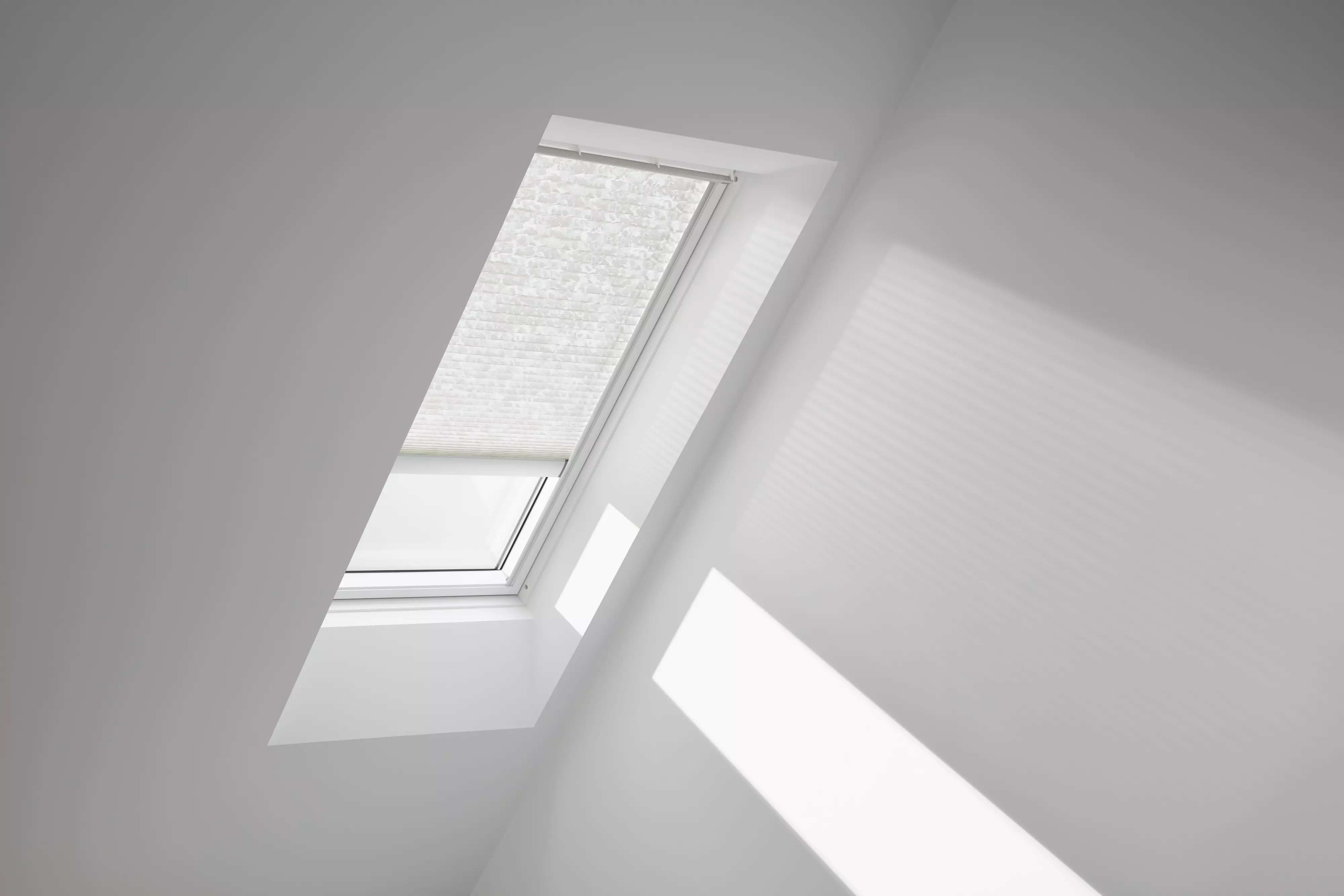 Lichtdurchlässige VELUX Plissees tauchen die Wohnräume Ihrer Kunden in eine besonders sanfte Lichtstimmung und schaffen individuelle Deko-Akzente.