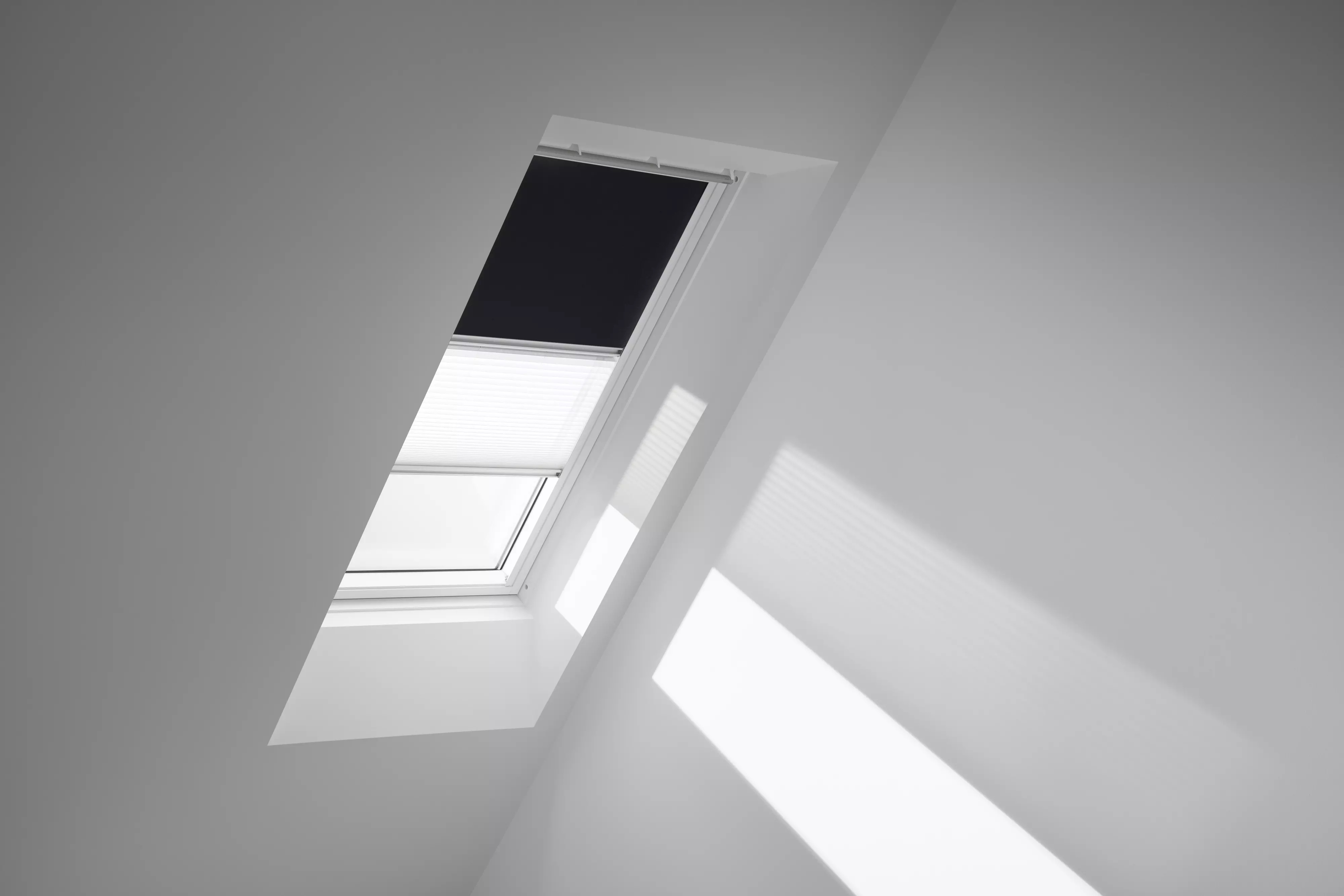 Bei Bedarf den Raum optimal abdunkeln oder das Tageslicht nur etwas abmildern und somit eine angenehme Raumatmosphäre schaffen. VELUX Verdunkelung Plus vereint zwei Produkte – Verdunkelungs-Rollo + Plissee - in einer Kombination. Regulieren Sie Licht und Schatten ganz nach Ihrem Bedarf.