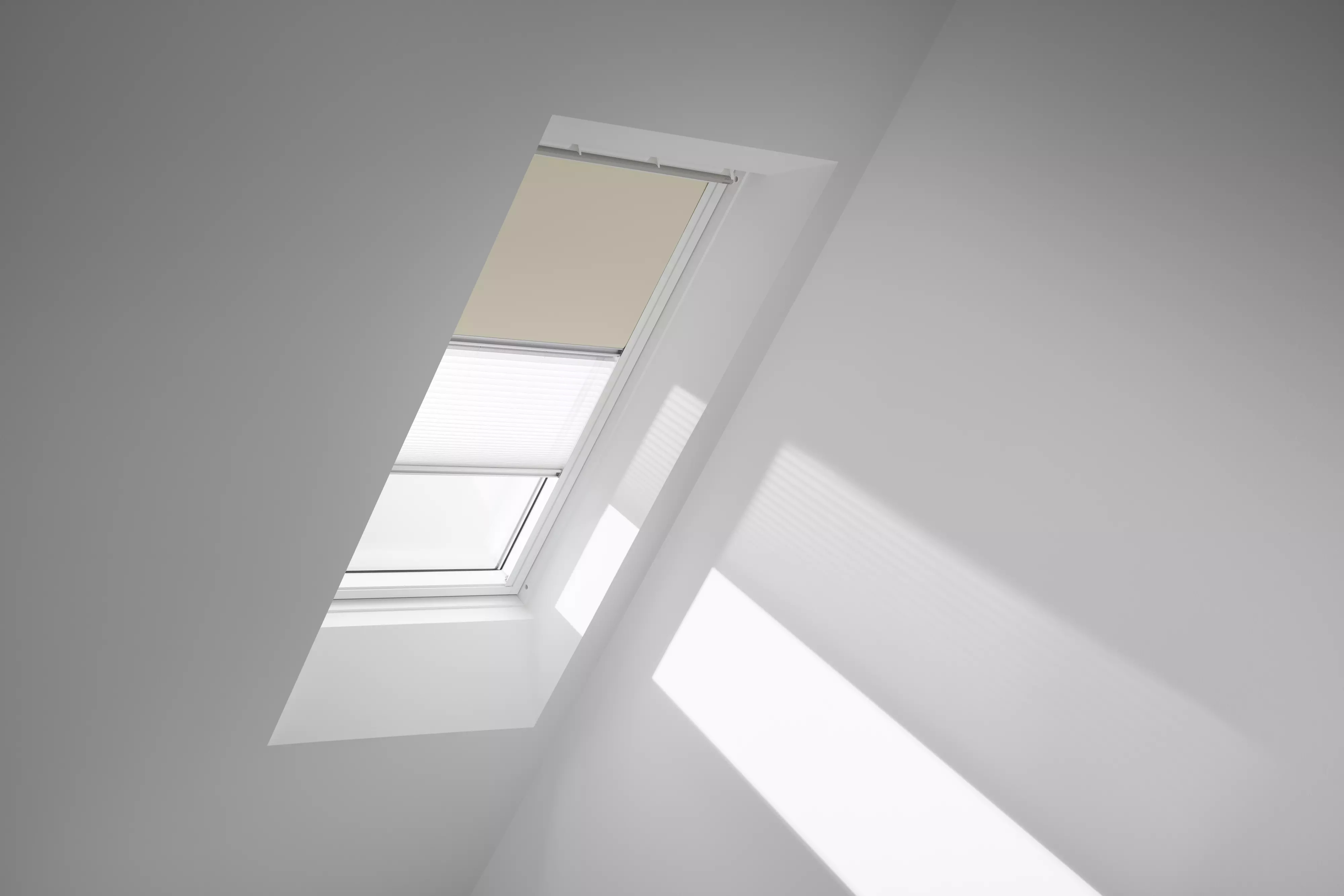 Bei Bedarf den Raum optimal abdunkeln oder das Tageslicht nur etwas abmildern und somit eine angenehme Raumatmosphäre schaffen. VELUX Verdunkelung Plus vereint zwei Produkte – Verdunkelungs-Rollo + Plissee - in einer Kombination. Regulieren Sie Licht und Schatten ganz nach Ihrem Bedarf.