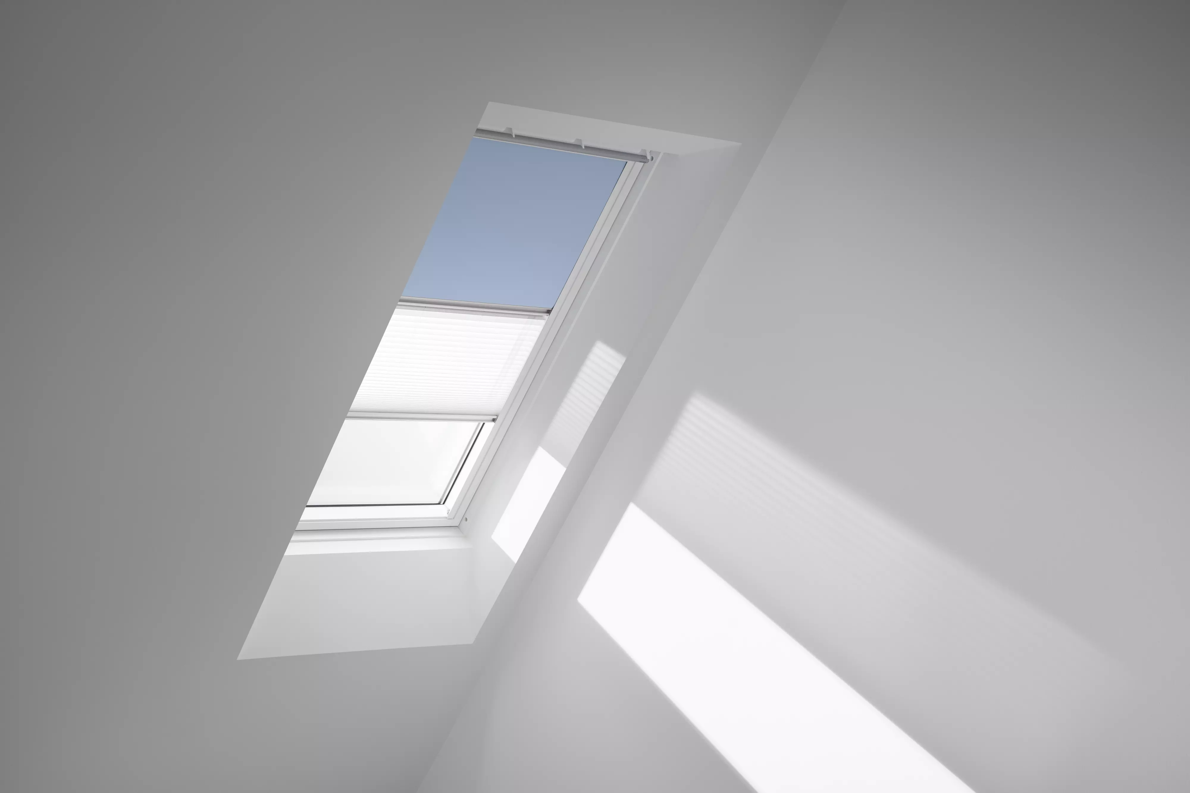 Bei Bedarf den Raum optimal abdunkeln oder das Tageslicht nur etwas abmildern und somit eine angenehme Raumatmosphäre schaffen. VELUX Verdunkelung Plus vereint zwei Produkte – Verdunkelungs-Rollo + Plissee - in einer Kombination. Regulieren Sie Licht und Schatten ganz nach Ihrem Bedarf.