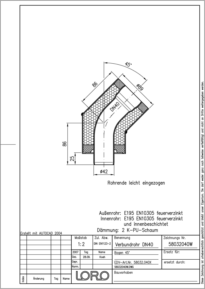 LORO-X Verbundrohr-Bogen, bestehend aus Innenrohr (LORO-X Rohr, aus Stahl, feuerverzinkt, nach DIN EN 1123, mit erhöhtem Qualitätsstandard gemäß RAL-Gütezeichen GZ-694, mit 2-Kammern-Steckmuffenverbindung, Baustoffklasse A1, formstabil, bruchfest, rückstausicher, langlebige Innenbeschichtung gemäß DIN EN ISO 2178 auf Basis einer 2K-Epoxid-Kombination, Farbton: Rotbraun), Dämmschicht (PU-Hartschaum B2, FCKW-frei) und Außenrohr (LORO-X Rohr, feuerverzinkt), 45 Grad, DN 40