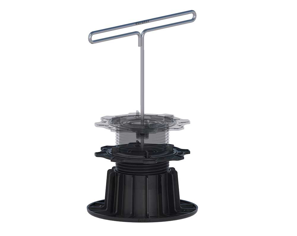 Die Verstellfüße GIANT von Eurotec eignen sich gezielt für die Einzelauflagerung von schweren, großformatigen Steinplatten oder Keramikfliesen. Die Reihe hat vier Varianten zu bieten, welche alle über einen stufenlos justierbaren Bereich von 40 bis 220 mm verfügen. Die Aufbauhöhe lässt sich mit dem Erweiterungsring GIANT um weitere 170 mm erhöhen.