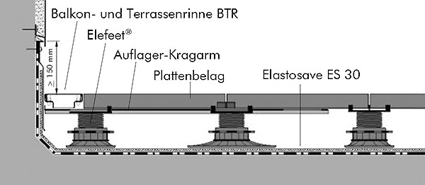 Müssen Belagszuschnitte im Randbereich oder soll die „BTR-Rinne“ entlang einer Fassade verlegt werden, so ist dies mit dem „Auflager-Kragarm“ möglich (siehe Abbildung), der auf zwei Elefeet®-Stelzlagern aufliegt und durch das Gewicht des Plattenbelages belastet wird.